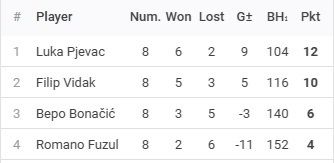 Ekipa koja se pojavila definitivno nije zaboravila da je DYP sezona malo duža utrka pa pogledajmo ukupnu ljestvicu: Bonačić uz full posjećenost drži jedinicu s obje ruke; Zalar nadoknađuje odsustvo efikasnošću; Pjevac neumorno igra tu dugu igru... ima još par imena ovdje u igri.. bit će zanimljivo gledati razvoj do kraja sezone